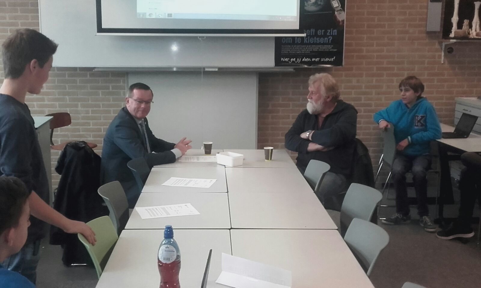 De wethouder meneer Veldhoen en zijn ambtenaar meneer Poortman uit Kampen zijn bij ons op bezoek geweest. Ze vertelden ons over een probleem in Kampen en Kampereiland, namelijk dat er overstromingsgevaar is. Ze zochten een oplossing voor dit probleem, en daarom vroegen ze ons om hulp. Ook hebben ze wat verteld over de geschiedenis van Kampereiland. Ze vertelden dat de veiligheid van mensen voorop staat omdat ze daar ook recht op hebben. Ook de kosten zijn belangrijk. Het plan moet zo goedkoop mogelijk maar wel goed zijn. Maar ze betalen liever wat meer geld dan dat mensen risico lopen hun eigendommen te verliezen. Wij kregen een aantal vragen om over na te denken en mee te nemen in ons plan: